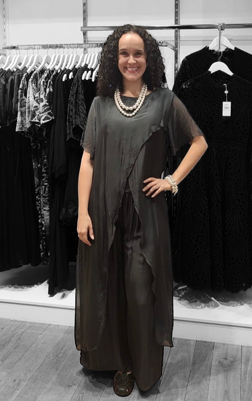 A silk mix fabric that drapes across on each side and down the length of the body. Finished with a sleeve above the elbow, this is the perfect top for layering over the silk trousers or our jeans.